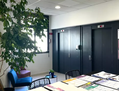 Nos nouveaux locaux ont été aménagés pour que nos étudiants soient dans un espace de travail confortable et puisse bénéficier d'espaces de détentes. Nous avons un espace cafétéria pour qu'ils puissent se restaurer lors de la pause de midi et se côtoyer.