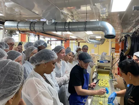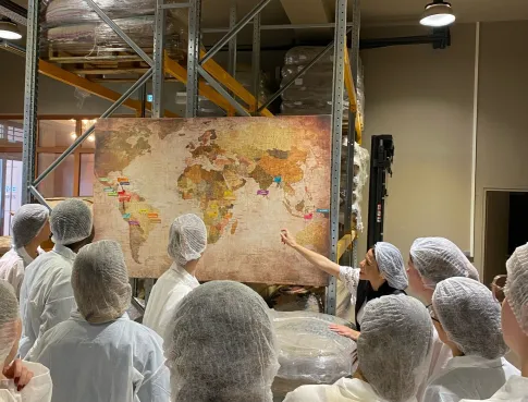 Les étudiants ont ensuite pu observer de près les différentes étapes de production des produits phares de la maison : les coussins lyonnais — confiserie emblématique protégée par une IGP —, les pralinés réalisés selon une méthode centenaire, mais aussi les chocolats fins et les cafés torréfiés sur place.